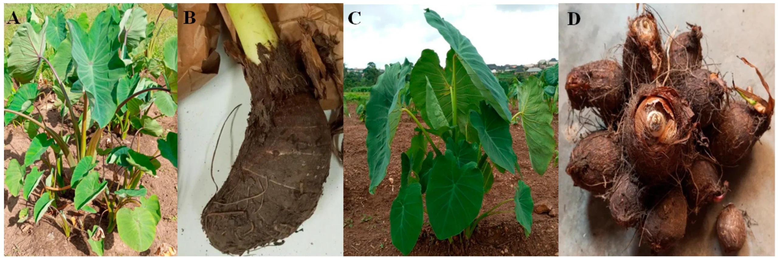 Dasheen and Eddoe taro plants and their underground parts: (A) shows the Dasheen taro plant; (B) shows its underground corm; (C) shows the Eddoe taro plant; (D) shows the Eddoe corm along with its smaller cormels.